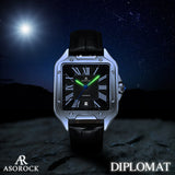 Introducing the Automatic Asorock Diplomat Collection, inspired by and a homage to the iconic Santos, this timepiece features a distinctive cut-off case top, Roman numeral markers, and blue-tipped hands on a sleek silver dial.
